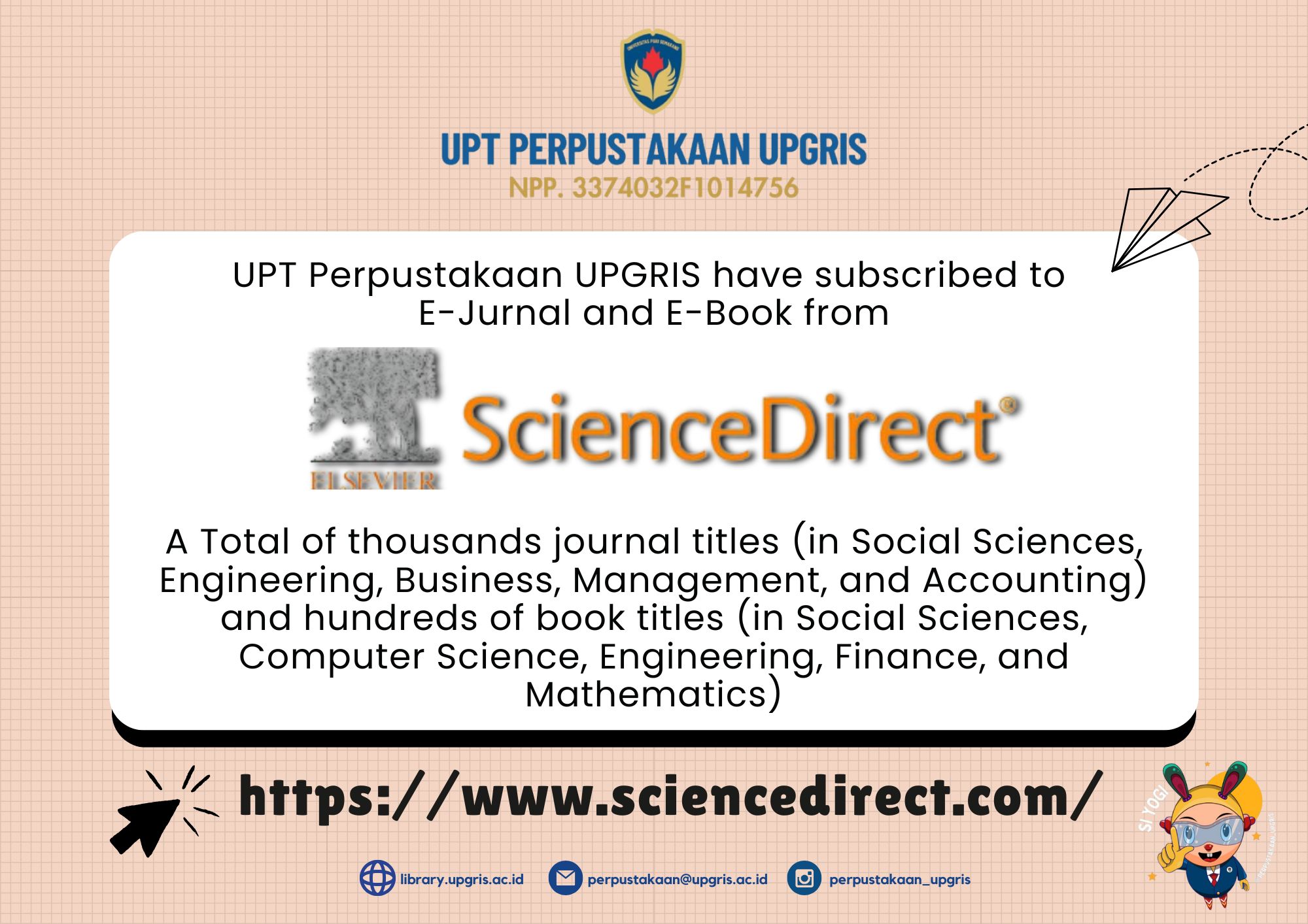 UPT Perpustakaan UPGRIS have subscribed to E-Jurnal and E-Book from Sciencedirect. A Total of thousands journal titles (in Social Sciences, Engineering, Business, Management, and Accounting) and hundreds of book titles (in Social Sciences, Computer Science, Engineering, Finance, and Mathematics).